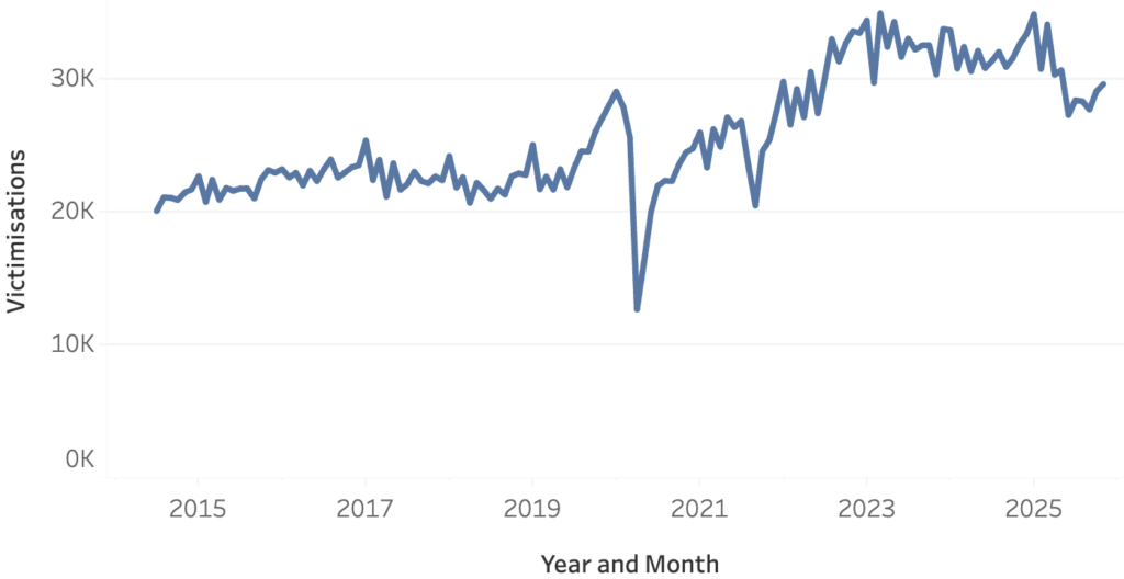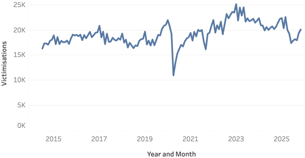 In terms of the crime types publicly reported in Victimisation Time & Place, this meant a jump from a typical profile of no more than 23,000 victimisations per month up to late 2019 to a high of just under 35,000 in March 2023 – an increase of around 66%. After March 2023, the rate stabilised and then fell, hitting a low of 27,240 victimisations in June 2025 before edging up slightly since.