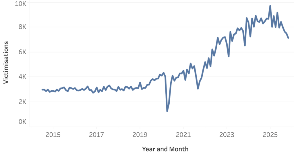 The rate of victimisations occuring in retail locations started its climb in mid-2019, continuing to an historical high of 9,695 in January 2025 – a three-fold increase following many years of 3,000 victimisations per month. From the January 2025 high, retail crime has plummeted over the past year, recording 7,106 victimisations last November… still well over double the pre-COVID rate.